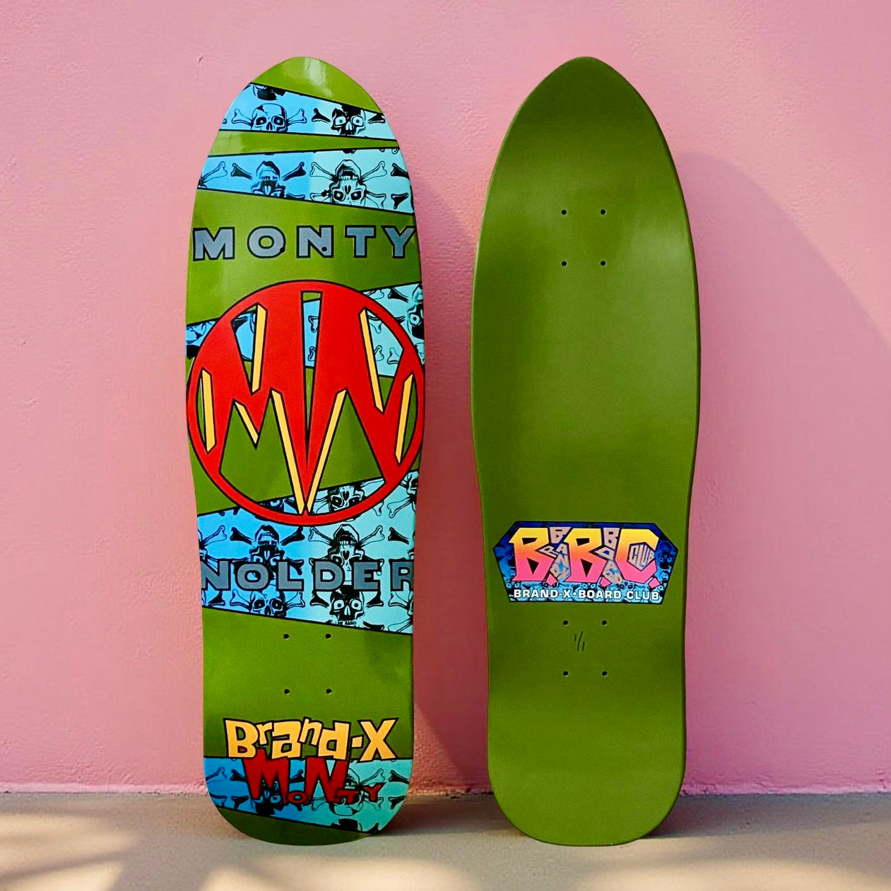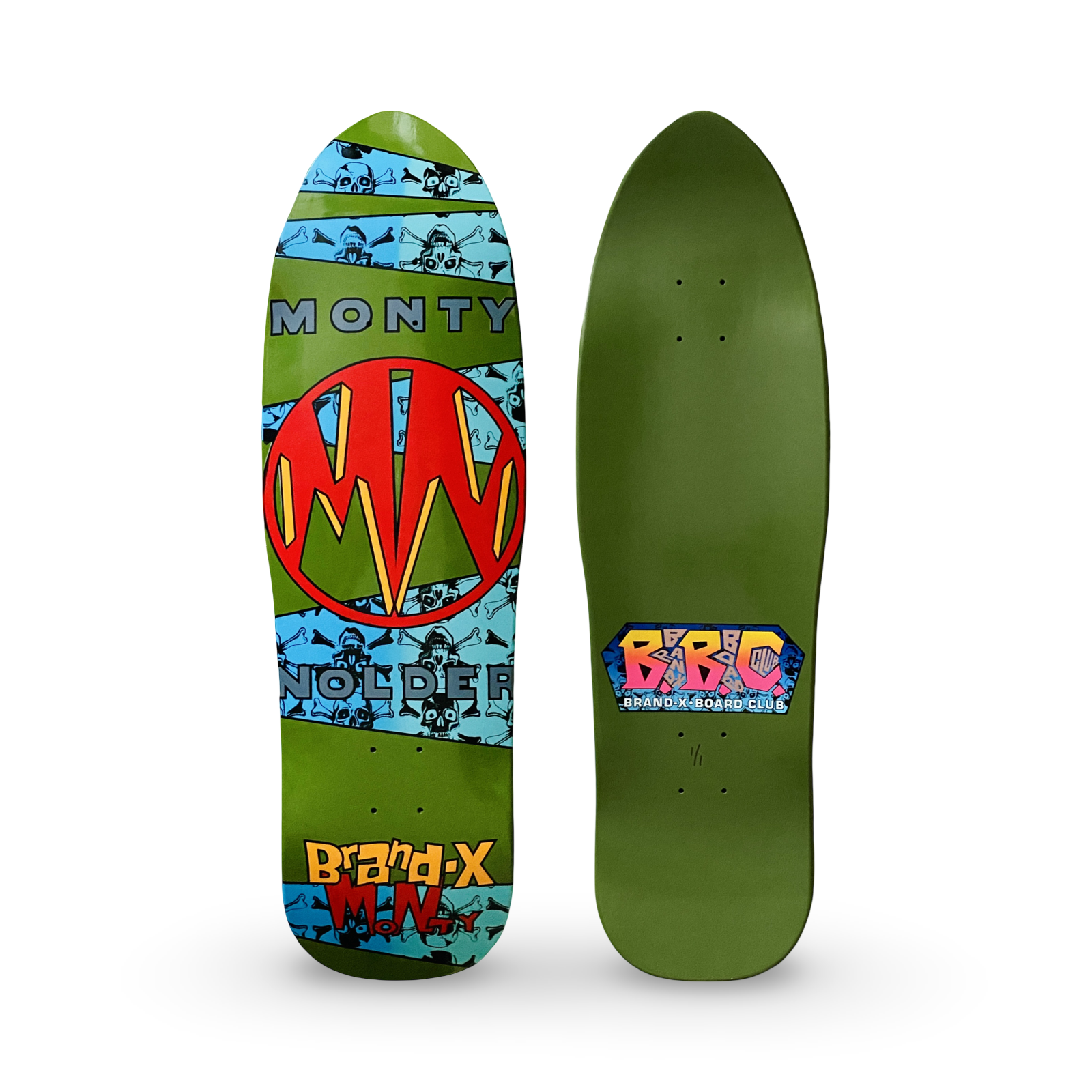 Brand-X Board Club (BBC) Monty Nolder ‘Not Mini’ Mini Deck - on our retro 9.5" BBC STINGER, Punk Point shape with hand-done, screen-printed graphics on a killer SPLIT VENEER deck